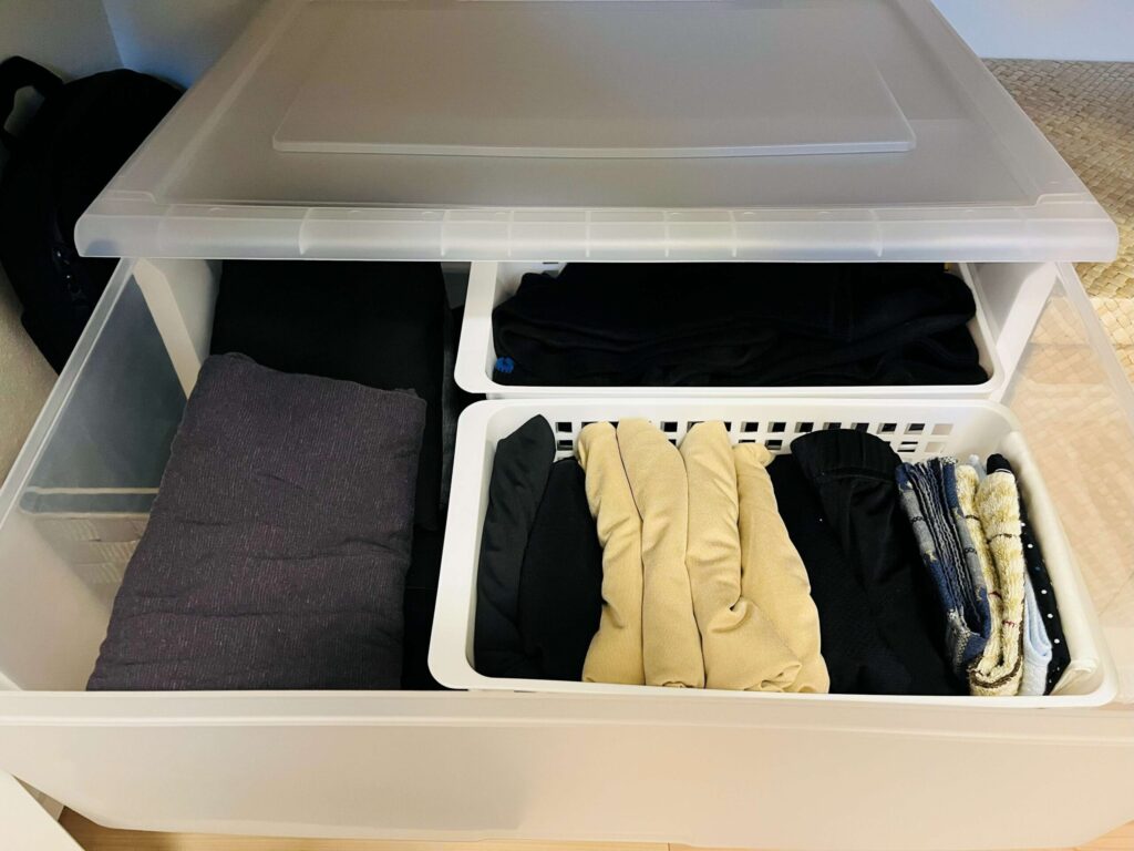 例えば、収納ケース上段は、右下が夏用肌着とハンカチ、右上が下着と靴下、左がヒートテック類となんとなく区切ってはいますが基本適当に入れているだけです。